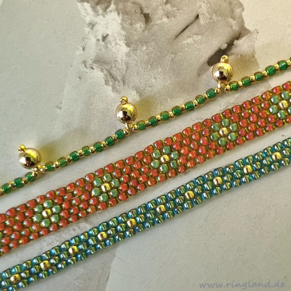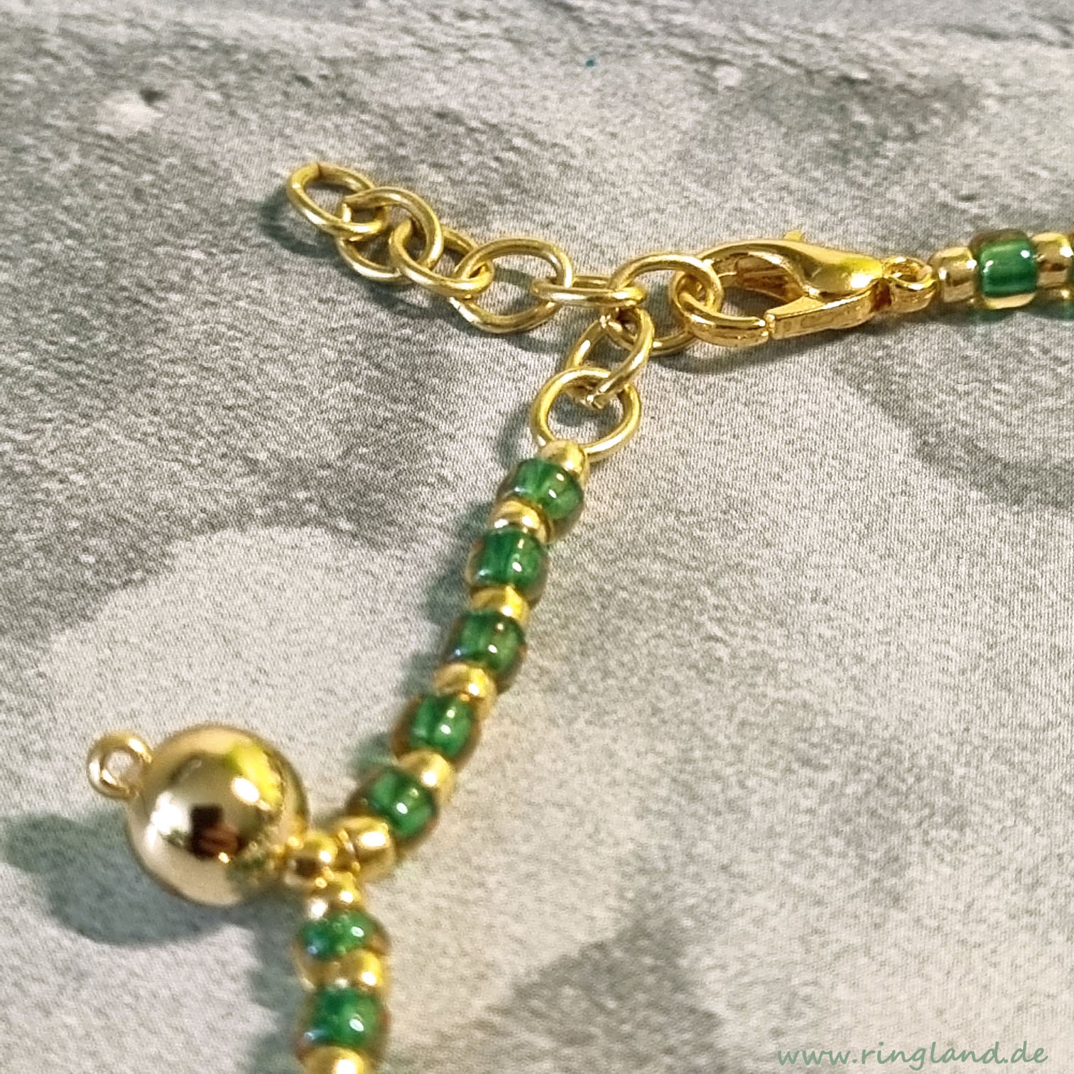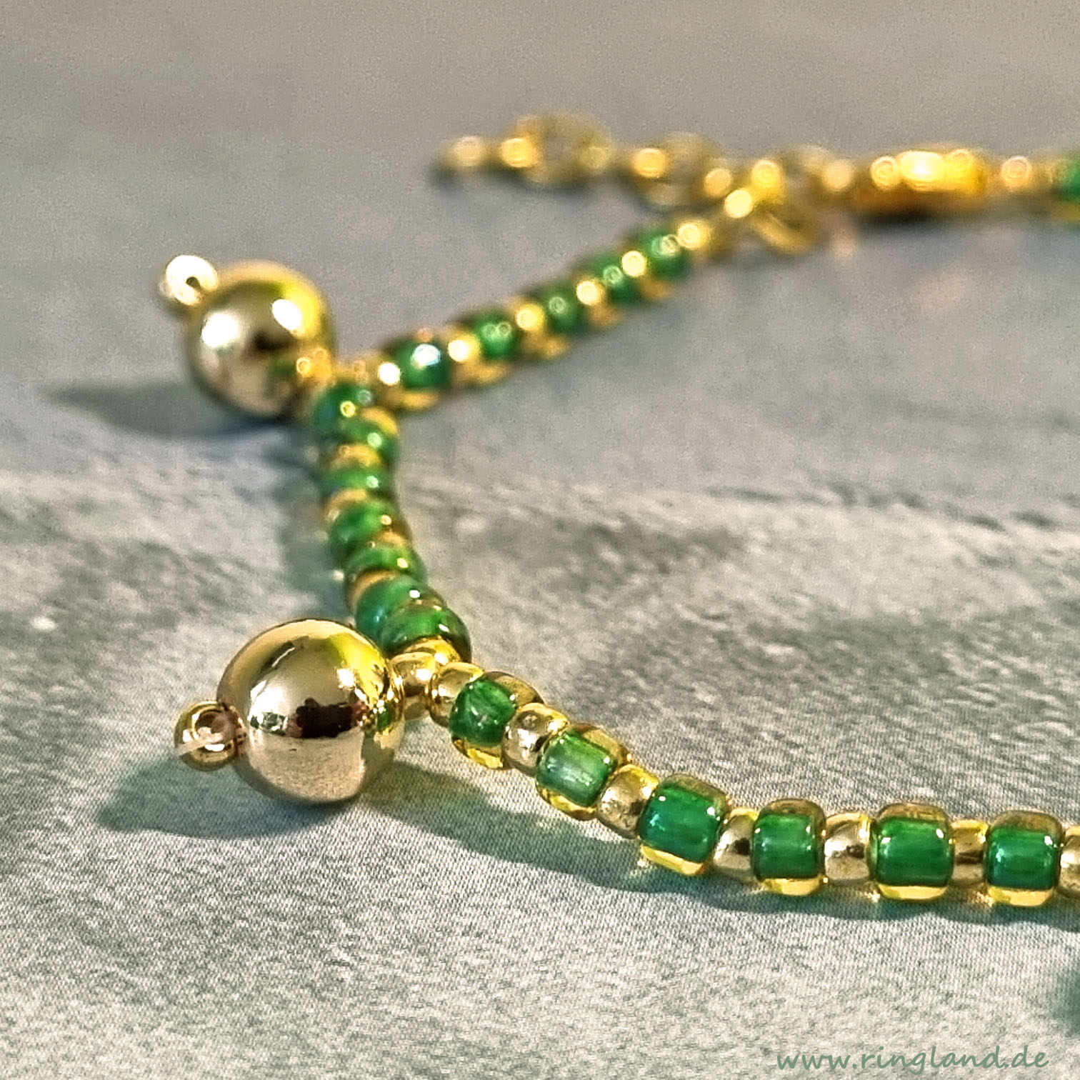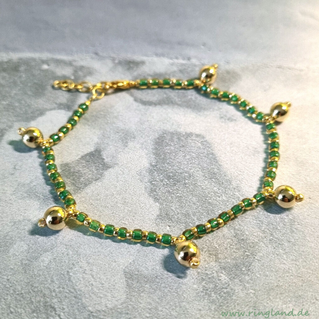 Das Goldkugelarmband LAZISE ist aus kräftig grünen sowie goldfarbenen japanischen Rocaillesperlen gefertigt, ergänzt durch größere goldfarbene Perlenkugeln. Es wird mit einem Verschluss aus Gliederkettchen und kleinem Karabinerverschluss gehalten. Viele Perlenfarben sind verfügbar, der Verschluss kann auch durch einen Magnetverschluss in silber- oder antiksilberfarben und goldfarben ersetzt werden.