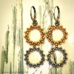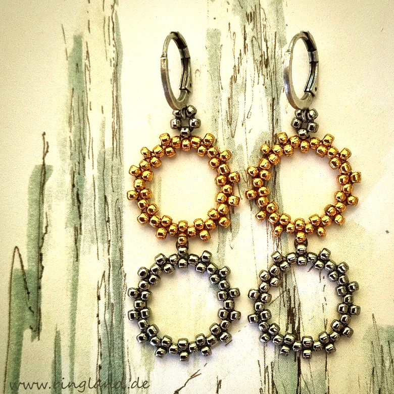 Die zweiteiligen RINGELOHRRINGE glänzen gold- silberfarben vor sich hin und sehen zu sämtlichen Outfits bezaubernd aus! Sie sind aus kleinen japanischen Rocaillesperlchen gefädelt und hängen hier an silberfarbenen, creolenförmigen Ohrhängern. Sie sind auch ein- oder dreiteilig erhältlich und natürlich auch nur gold- oder silberfarben. Oder „umgekehrt“ angeordnet und dann mit goldfarbenen Ohrrhängern.