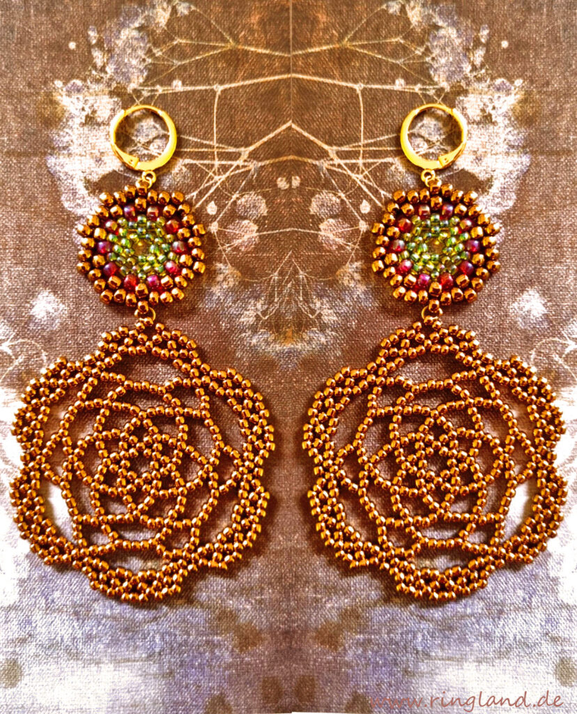 Diese Goldstücke für die Ohren sind aus unzähligen japanischen Rocaillesperlchen in kräftigem warmen Goldton mit grünen und weinroten Akzenten gefädelt. Sie passen super zum derzeit wieder hochaktuellen Bohème Stil, sind aber natürlich tragbar zu jedem Look und besonders schön zum Pferdeschwanz und zu kurzen oder hochgesteckten Haaren, aber natürlich nicht nur …