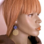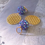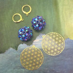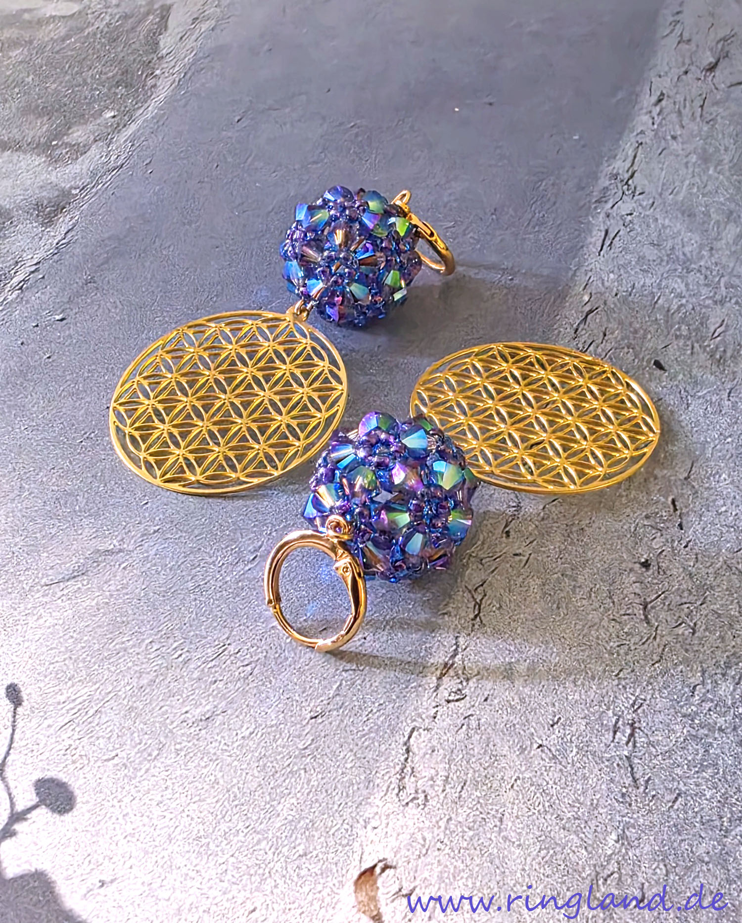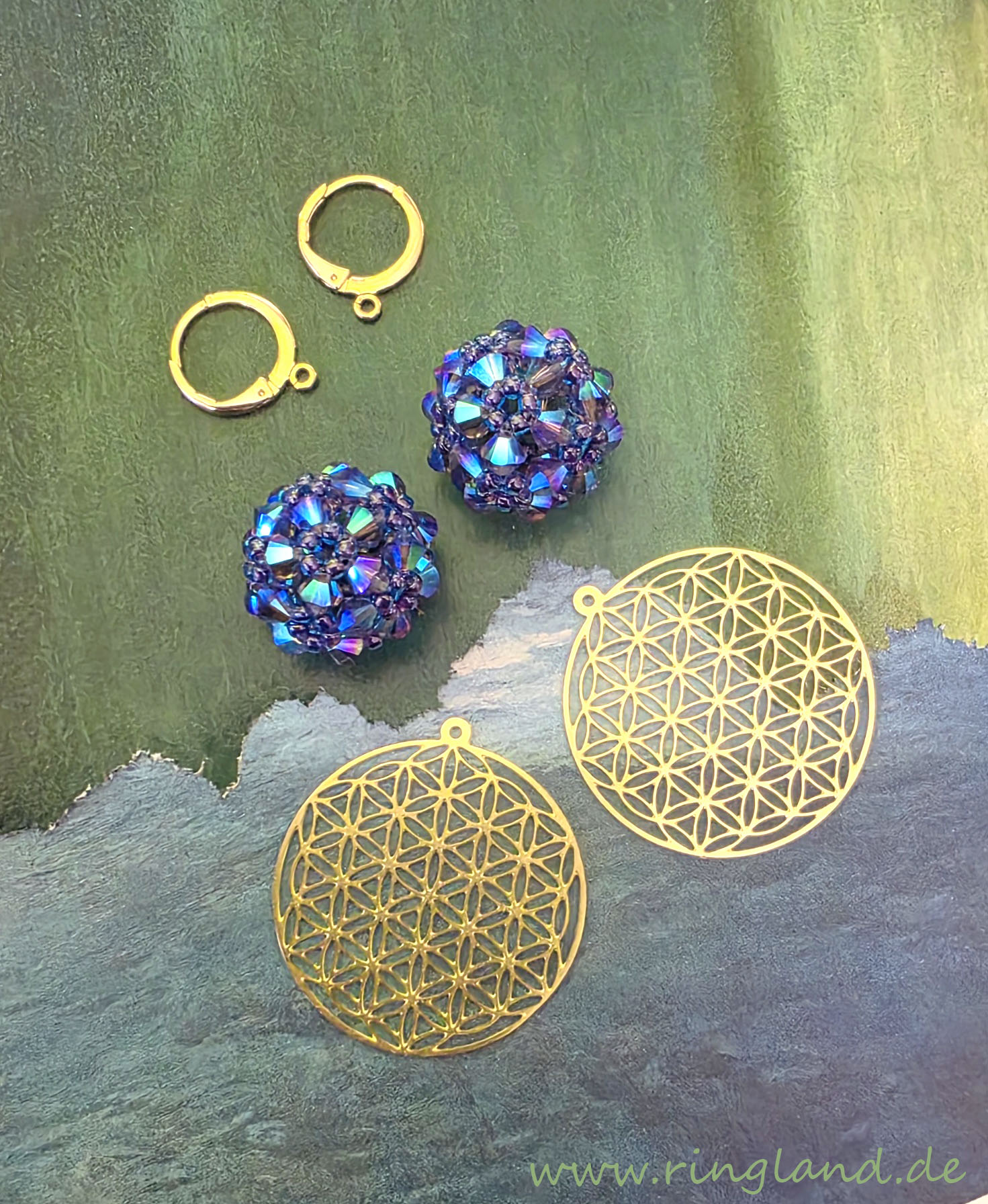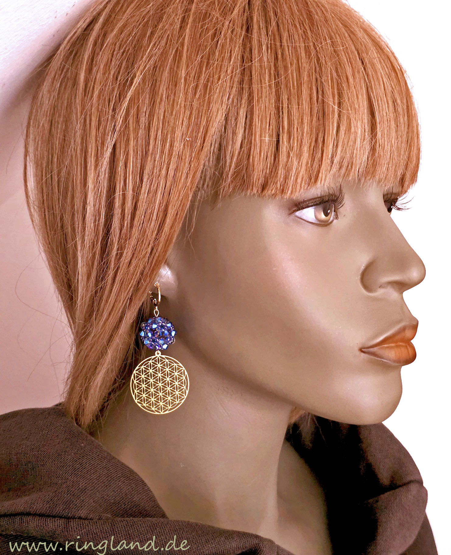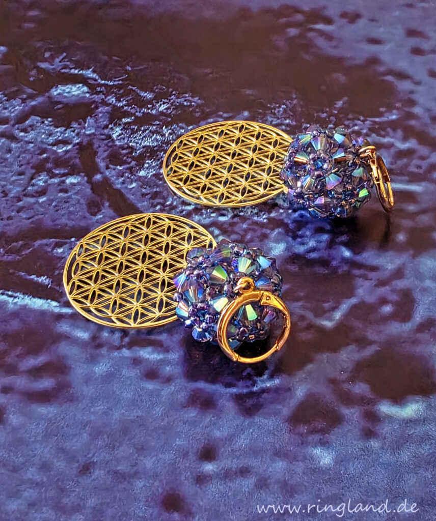 Rosetten aus leuchtend blauen Swarovski Kristallperlen mit satinierter Oberfläche, die je nach Lichteinfall viele verschiedene Farben hervorbringt, formieren sich um kleine, etwas blauviolette Rocailleskreise zu einer Kugel. Das i-Tüpfelchen sind die goldfarbenen Blütenornamente, die die Blume des Lebens symbolisieren. Strahlender Ohrschmuck, dazu federleicht.