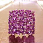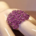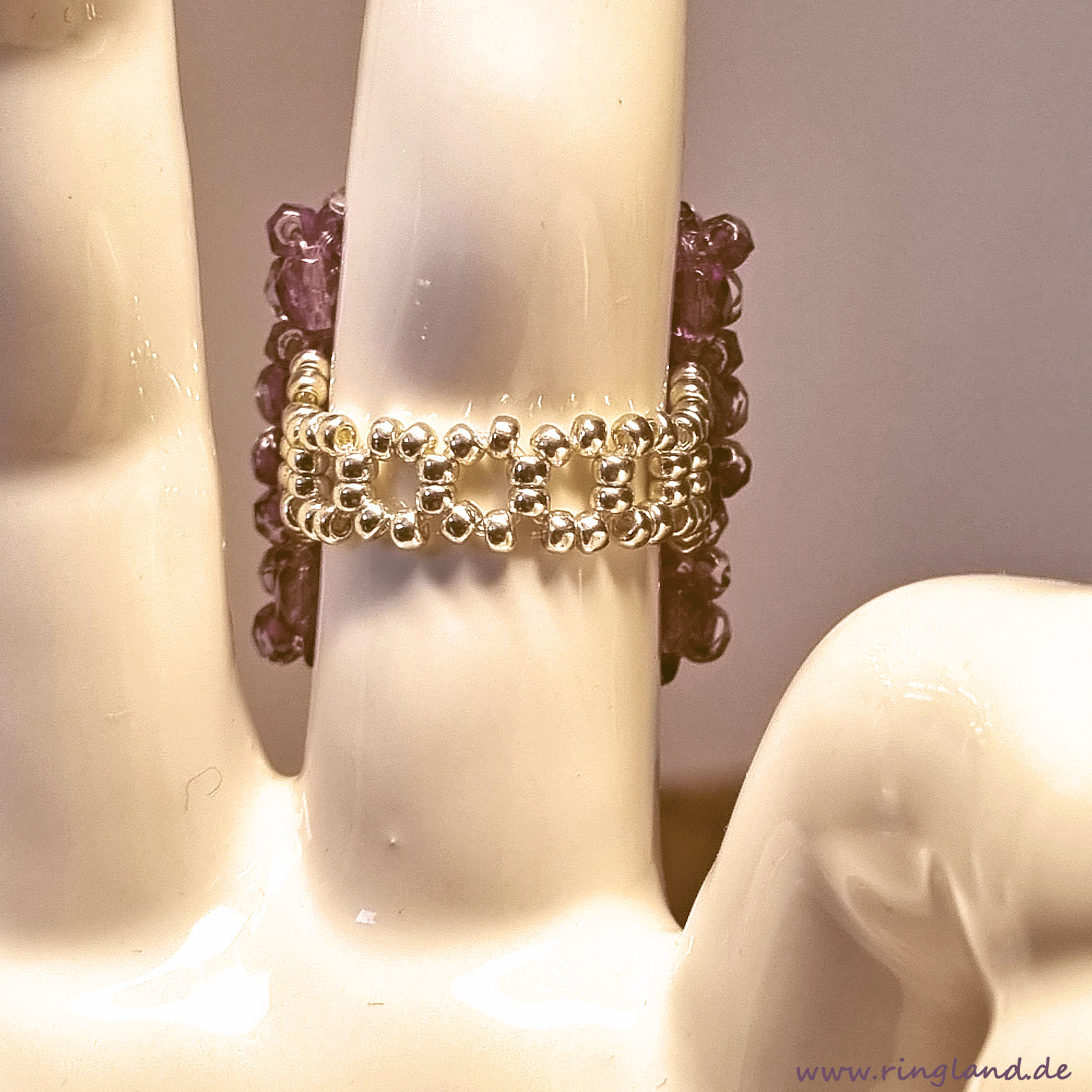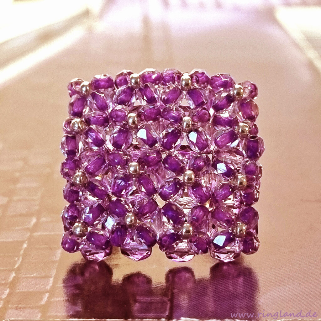 Ring LISSABON ist ausschließlich aus böhmischen Glasschliffperlen gefertigt. Der „Unterboden“, den ich Perlengitter nenne, ist aus Glasschliffperlen in einem marmorierten rötlichen Violett gefädelt. Die etwas kleineren Perlen auf der Ringoberfläche sind crystalfarben und haben eine kräftig rosaviolette „Linierung“, das heißt, das Perlenloch ist in dieser Farbe ausgekleidet und gibt den Perlen einen sehr besonderen Farbeffekt. Der Ring gibt jedem Kleidungsstil, egal ob lässig oder elegant, einen wundervollen Akzent. Er fällt auf. Und ist sehr besonders.