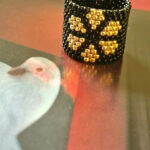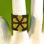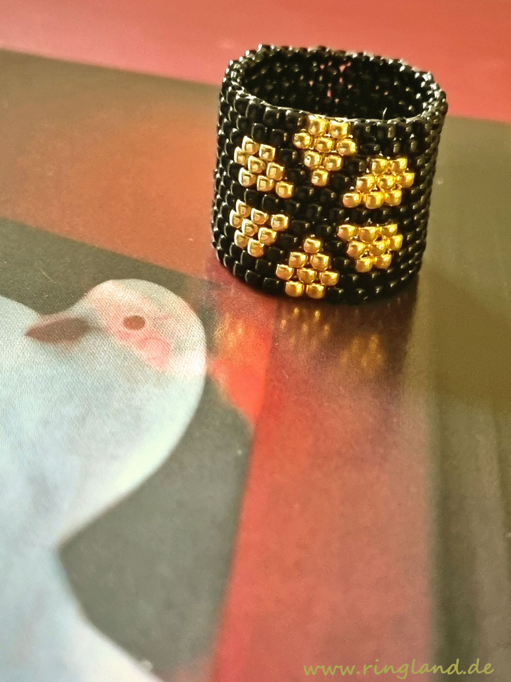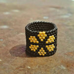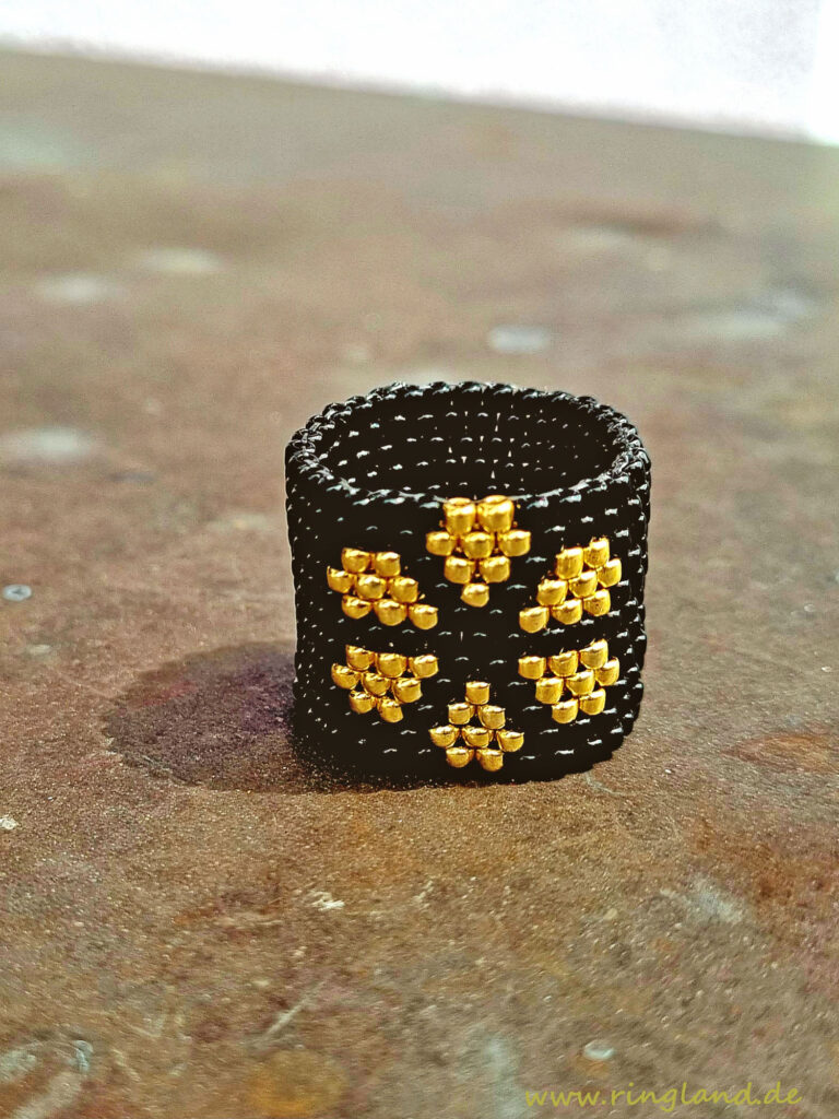 Ring RIGA ist aus unzähligen kleinen Rocaillesperlchen gefädelt und in sich geschlossen. Die Perlen sind schwarz und goldfarben, er kann jedoch in fast jeder Wunschfarbe hergestellt werden.