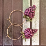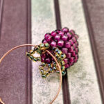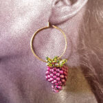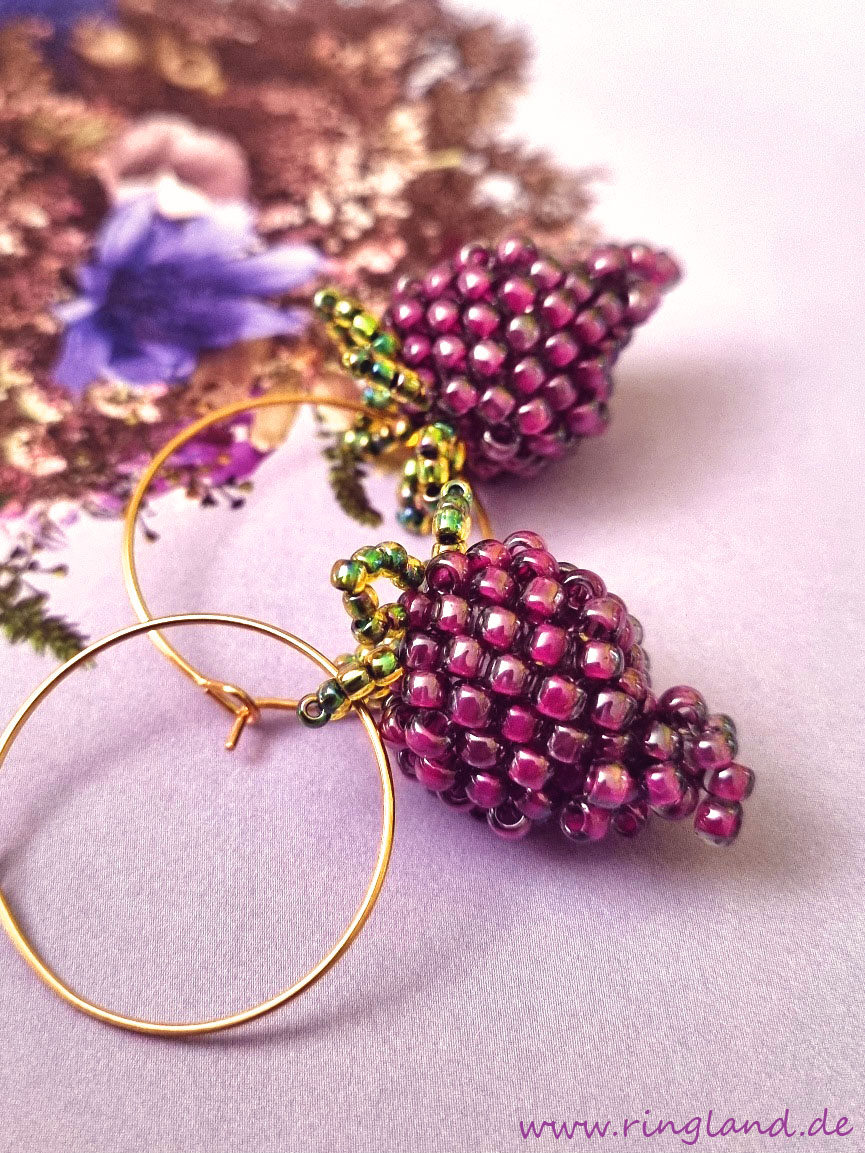Die TRAUBENOHRRINGE sind aus japanischen Rocaillesperlen in kräftigem Rotviolett in Runden gefädelt und mit grünen Blätterkränzchen am oberen Ende versehen. Die dünnwandigen Creolen (die es in verschiedenen Größen gibt) werden einfach durch die Mitte eines Blättchens geschoben. Die beiden Trauben sind nicht exakt identisch, ganz wie in der Natur.