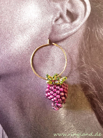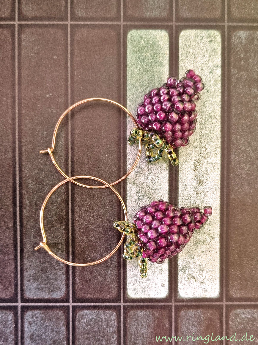 Die TRAUBENOHRRINGE sind aus japanischen Rocaillesperlen in kräftigem Rotviolett in Runden gefädelt und mit grünen Blätterkränzchen am oberen Ende versehen. Die dünnwandigen Creolen (die es in verschiedenen Größen gibt) werden einfach durch die Mitte eines Blättchens geschoben. Die beiden Trauben sind nicht exakt identisch, ganz wie in der Natur.